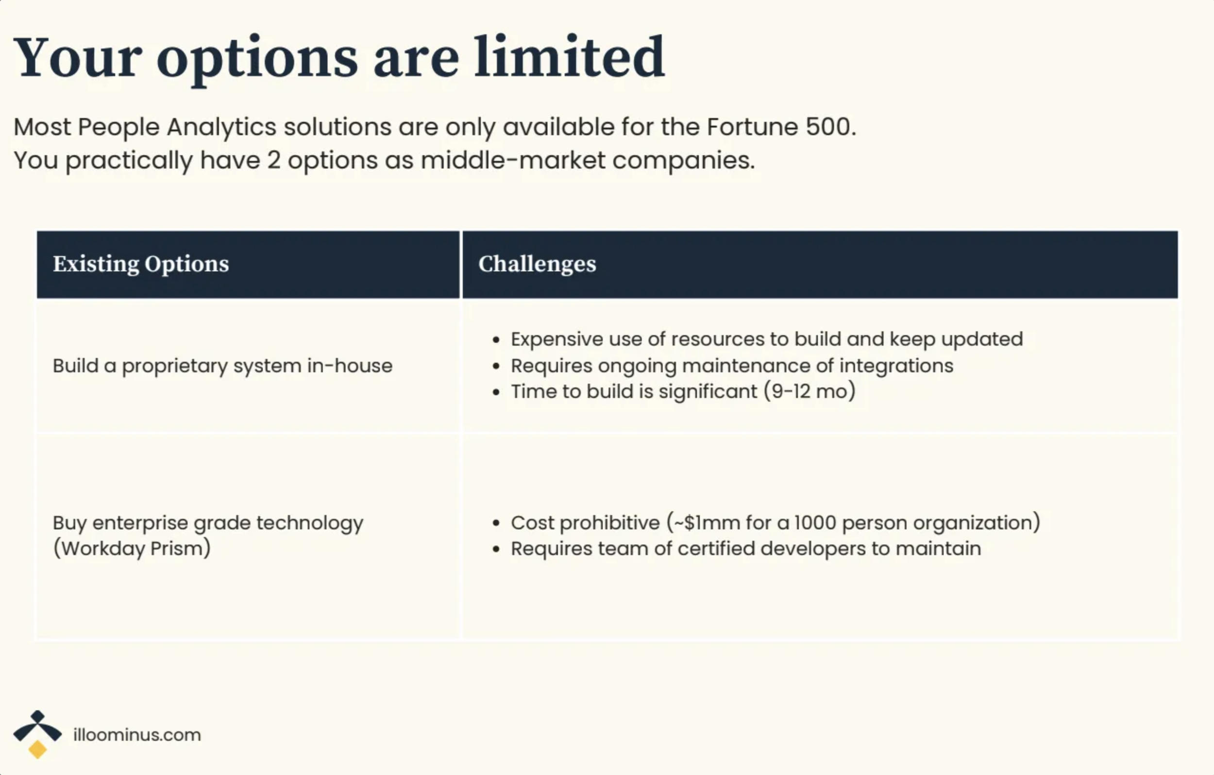 Typically when a new People Analytics leader starts at a middle-market company, we see they either choose to build a proprietary system in-house or buy enterprise-grade technology that is expensive and slow to onboard and maintain. Those options tend to set organizations back in terms of time and budget without enough ROI.